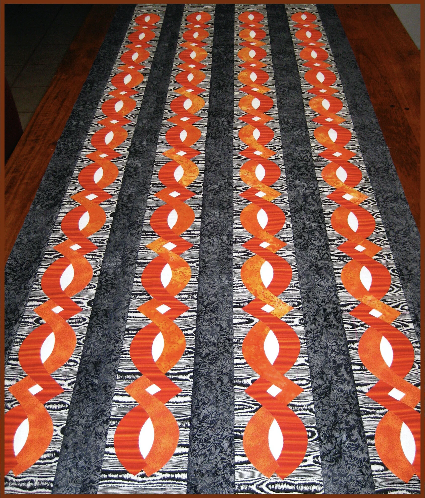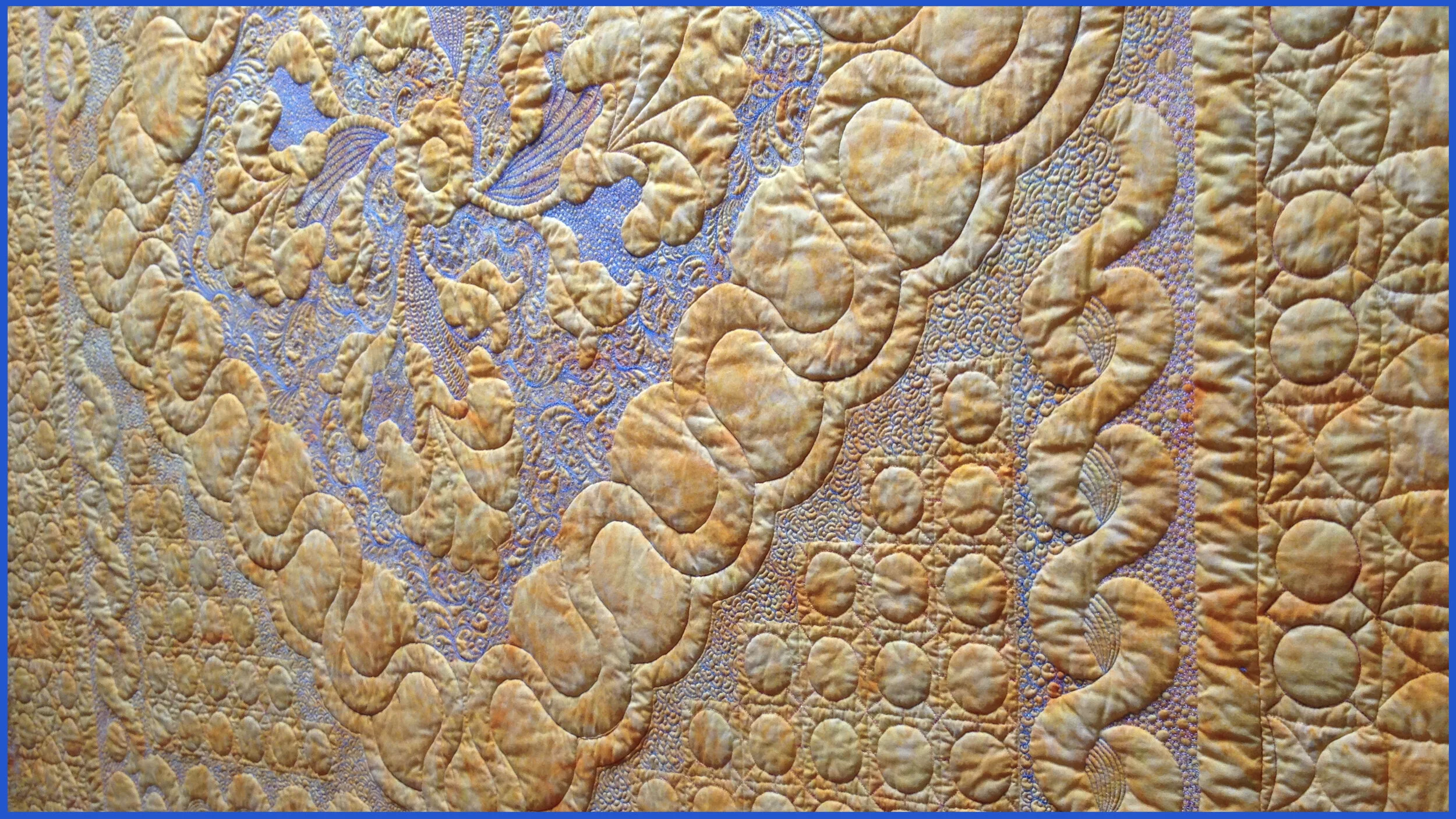 Teri Lucas' fabulous domestic machine quilting shows wonderfully with blue bobbin thread on the orange backing fabric